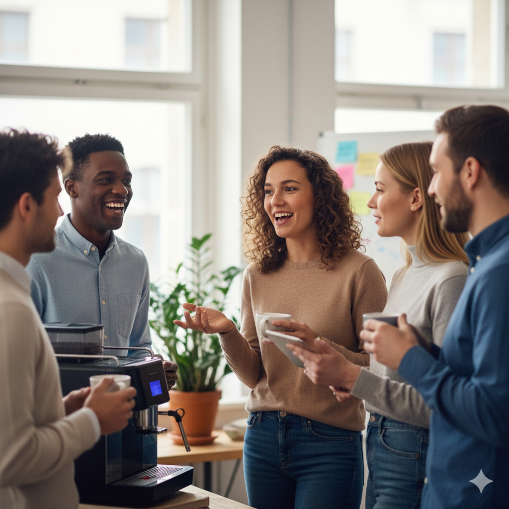 At the coffee machine, you smile a lot (too much), because the conversation moves fast, goes everywhere, and you don't know how to jump in.